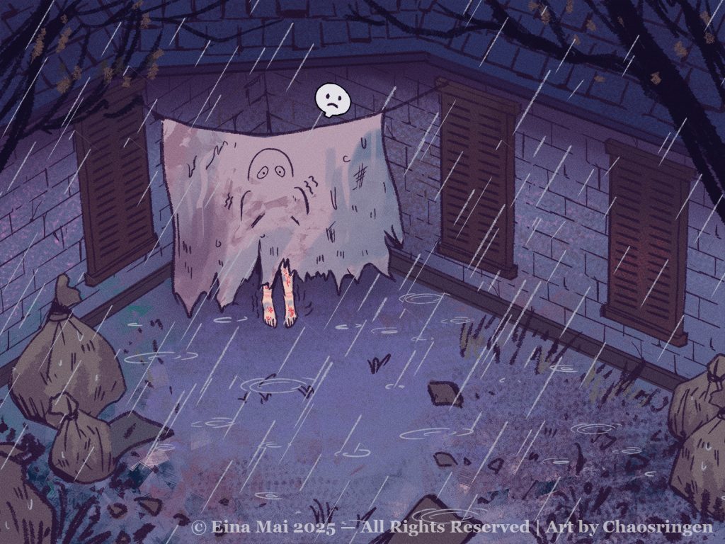 From afar, the setup would have scared the living daylights out of anyone. Quiet alley, pouring rain, dark and eerie corner, ripped, bloodstained curtain, and a pair of protruding pale feet. And that’s precisely his intention. He wants to make his nook as creepy as possible. He doesn’t want anyone or anything to disturb him right now.