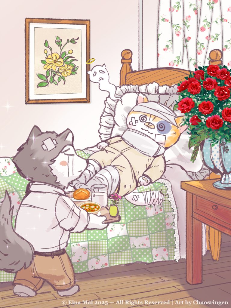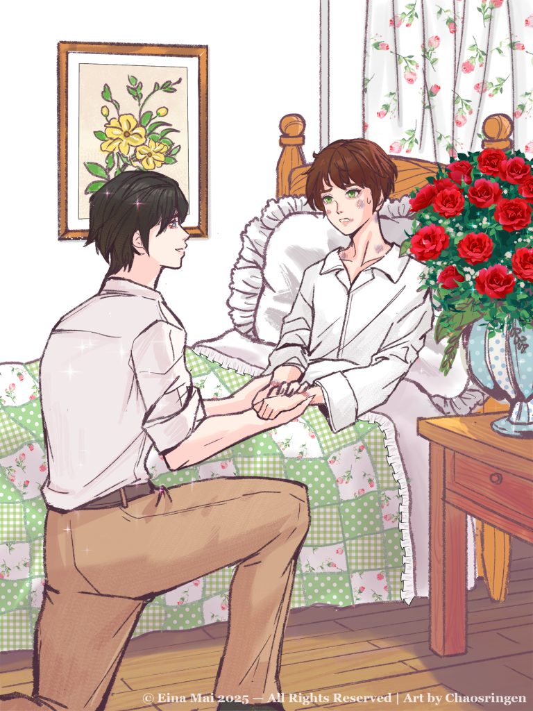 Cyril sits Eli down on a soft, cushioned bench by the bay window. Then, he kneels to apply new bandages to Eli’s legs. This time, Eli is wearing a new set of cream-colored summer pajamas with short sleeves and short pants to make it easier for Cyril to tend him.