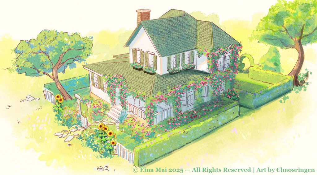 Cyril shows him the backyard first, and to Eli’s surprise, the garden is absolutely amazing. It looks like a classic landscape oil painting by old-school artists. Plush, green grass covers the entire garden, stretching into the endlessness of the faraway forest. It’s bordered by verdant boxwood hedges speckled with tiny purple flowers. Large bushes of white roses spiral along the two white oak posts of the patio. There are shrubs of various pastel flowers brimming from every edge of the yard. A grove of three beeches peacefully flanks the left of the house, and their cascading branches drift down to screen the white porch from the dull heat of the summer’s sun.